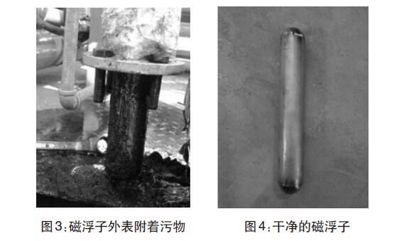 經(jīng)過兩年多運行,污水罐內(nèi)可能沉淀污泥雜質(zhì)導(dǎo)致液位計示數(shù)不準(zhǔn)?,F(xiàn)場拆卸液位計,并且對浮球和磁浮子進(jìn)行清洗。(圖3-圖4)